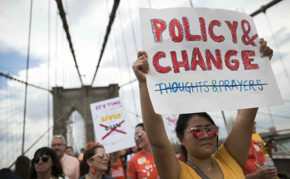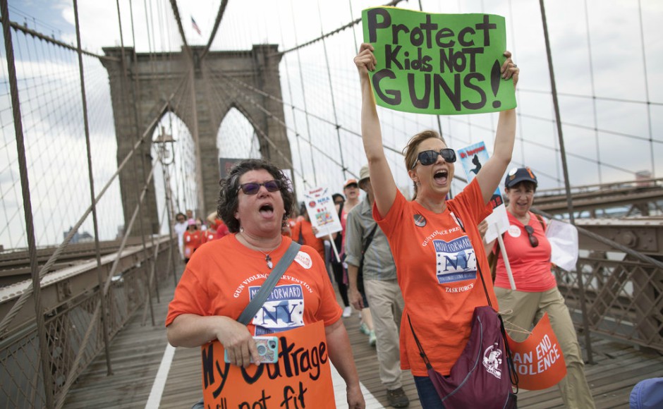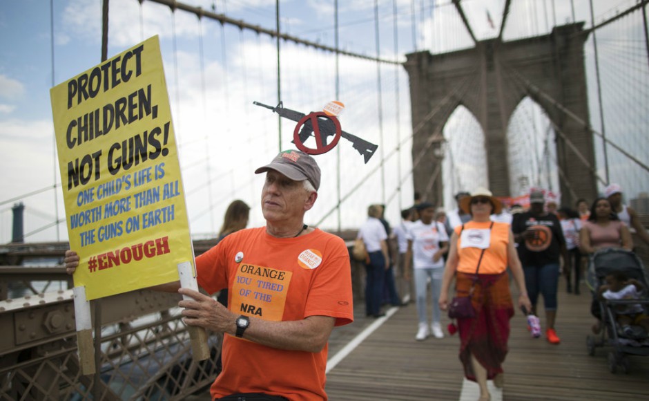 A crowd of hundreds, most wearing orange in honor of National Gun Violence Awareness Day, gathered in a park on the Brooklyn side of the Brooklyn Bridge, many holding photos or wearing T-shirts with the images of people lost, CBS New York said. AP