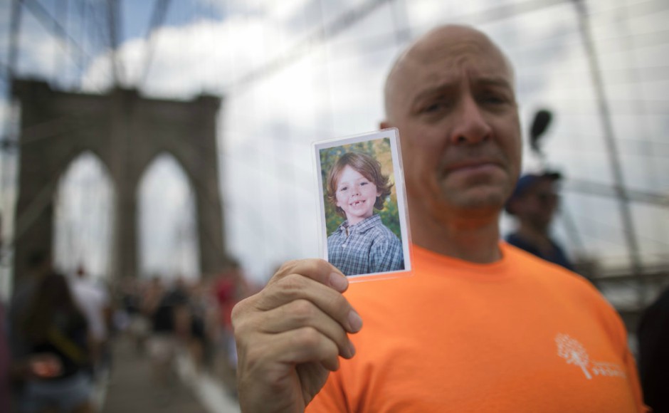 A demonstrator carries a prayer card for Daniel Gerard Barden, a victim of the Sandy Hook elementary school shooting, as he walks over the Brooklyn bridge during a march and rally against gun violence. AP