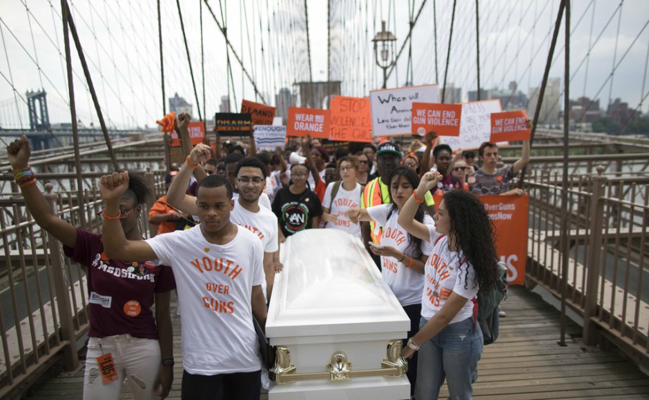 Youth Over Guns, a gun violence prevention organization in New York City, lead a march across the Brooklyn Bridge to call for youth empowerment and investment in urban communities to end gun violence. AP