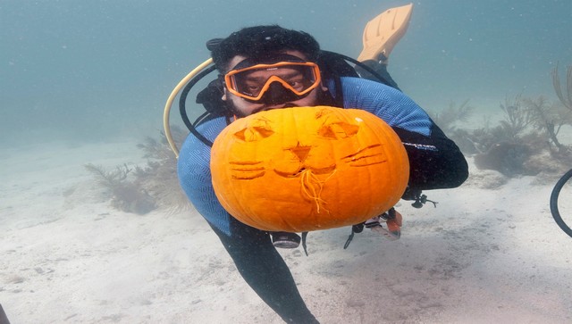 A scuba-diver shows his carved pumpkin during the Underwater Pumpkin Carving Contest held in Florida. Before pumpkins, turnips and potatoes were used by Celtics to light the way to their homes and to let good spirits enter. Later, when Irish migrants entered America, pumpkins were made the face of Halloween. AP