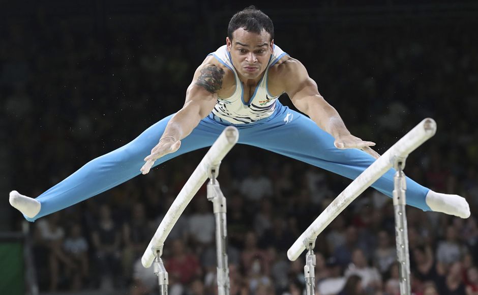 Rakesh Patra competes on the parallel bars in the men’s artistic gymnastics he qualified for the final of the rings apparatus in the men’s artistic competition after scoring 13.950 in the team all around event. PTI