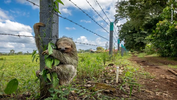 No Place Like Home: A brown-throated three-toed sloth clinging tightly to a barbed wire fence post. Image Courtesy: Emmanuel Tardy/Wildlife Photographer of the Year