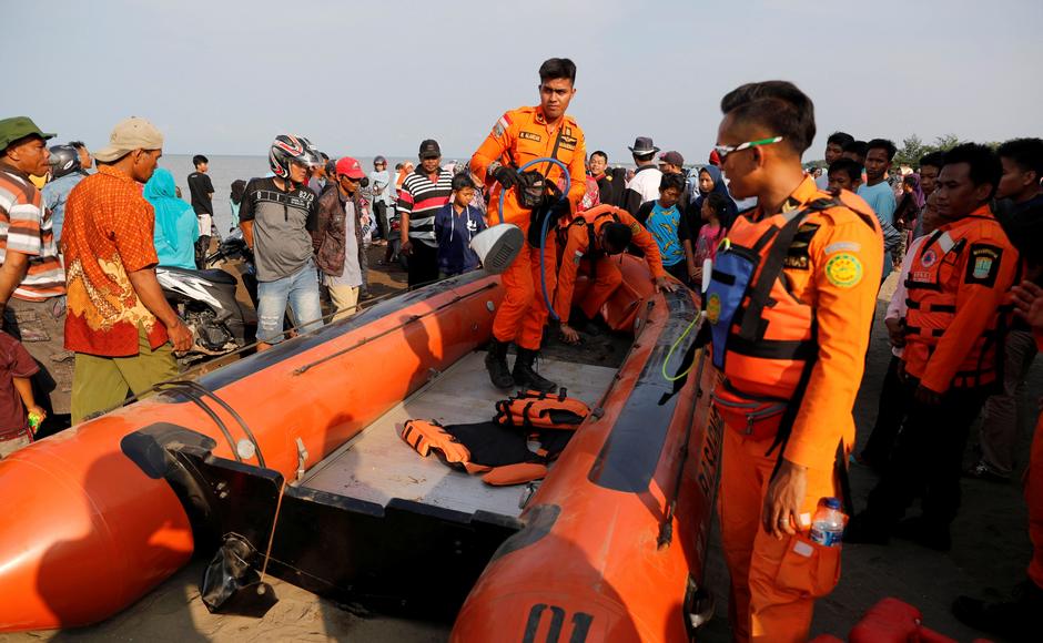 People watch rescue team members heading to the Lion Air flight JT610, sea crash location in the north coast of Karawang regency, West Java province. Reuters