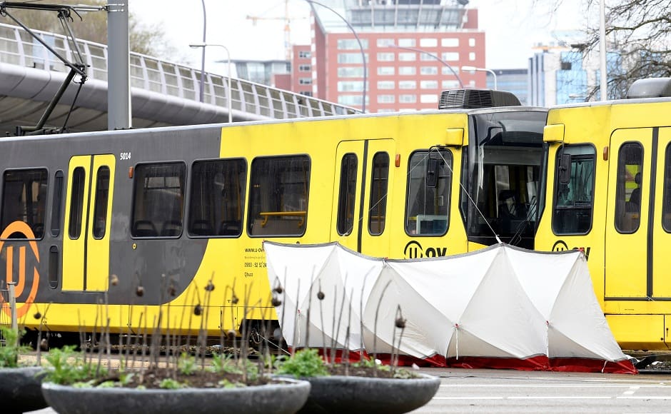 Three died and 9 were injured after a gunman opened fire on a tram in the 24 Oktoberplein area of the Dutch city of Utrecht on Monday. Seen here is a white screen covering the spot where a body was seen. Reuters