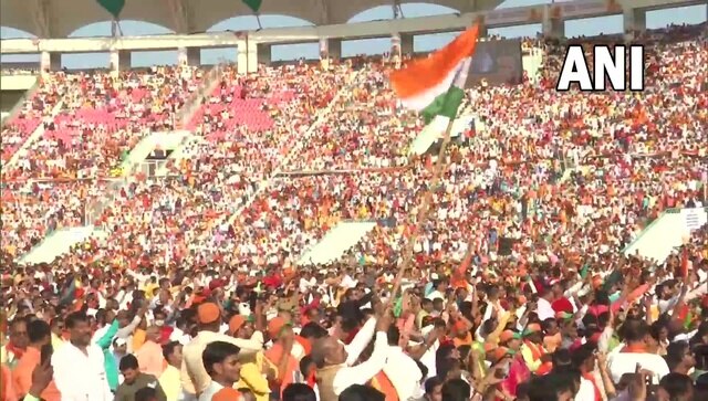 A massive crowd turned up at the Atal Bihari Vajpayee Ekana Stadium, Lucknow, to watch Yogi Adityanath take oath as the chief minister for the second term. ANI