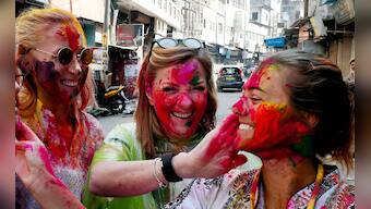 Foreigners playing with colours on the occasion of ' Holi festival' celebration in New Delhi on Monday. PTI