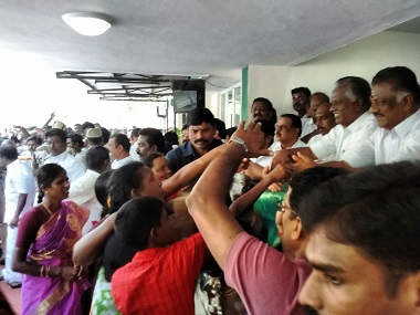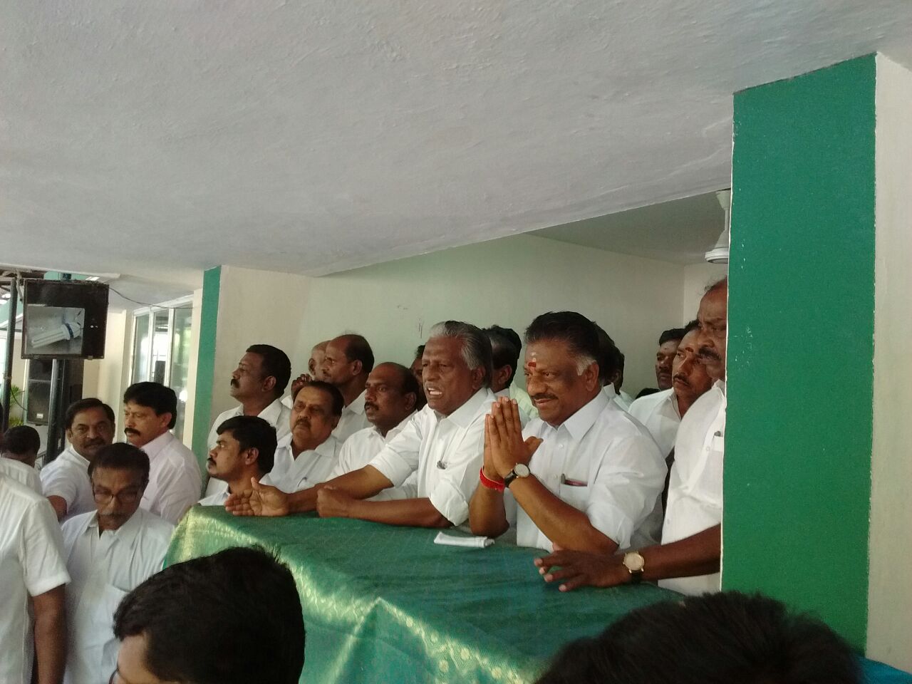After a brief interaction with media persons on Saturday morning, AIADMK party workers who had thronged the O Panneerselvam residence since morning were allowed inside. Though everyone from Members of Parliament Namakkal Sundaram and Ashok Kumar of Krishnagiri, to Jayalalithaa’s classmate Bader Sayeed and Former MLA C Aranganayakam addressed the media, Panneerselvam remained quiet at most times.