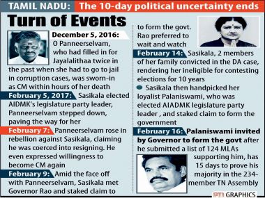 Amidst the growing suspense over the pending Supreme Court verdict on VK Sasikala’s involvement in the disproportionate assets case and Attorney General’s advice for a floor test, here are the key highlights on how the Tamil Nadu political crisis took shape on the seventh day.