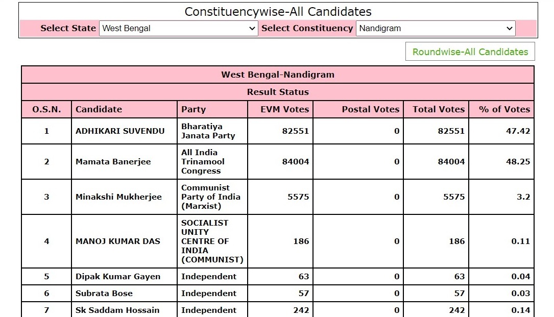 West Bengal, Assam, Tamil Nadu, Kerala, Puducherry Election Result 2021 Live Updates: As of the update at 10.30 pm on the EC’s website, Mamata Banerjee is leading by 820 votes in the Nandigram constituency. Banerjee has secured 1,03,571 votes while Adhikari has secured 1,02,751 votes. According to news reports, a three-member Trinamool Congres delegation is meeting Chief Electoral Officer at EC Office in Kolkata seeking a recount of votes in Nandigram and other issues. As of 8.45 pm, according the official EC website, Mamata Banerjee is leading in Nandigram with 84,004 EVM votes. However, her opponent, and TMC turncoat Suvendu Adhikari tweeted out thanking the people of Nandigram for choosing him as their representative. “My sincere thanks to the great People of Nandigram for their love, trust, blessings, and support, and for choosing me as their representative and the MLA from #Nandigram. It is my never-ending commitment to be of service to them and working for their welfare. I am truly grateful!” Prime Minister Narendra Modi tweeted, “Congratulations to Mamata Didi for @AITCofficial’s win in West Bengal. The Centre will continue to extend all possible support to the West Bengal Government to fulfil people’s aspirations and also to overcome the COVID-19 pandemic. @MamataOfficial”. Mamata is all set to return as the Bengal CM for a third consecutive term. Congress leader Rahul Gandhi also congratulated the TMC chief as the TMC is headed for a return to power in the state. As per the latest result trends available on the EC website for the 292 of the 294 seats in Bengal, the TMC has won 34 and was ahead in 177 seats while the BJP has won six seats and is ahead in 73. “I would like to thank my sisters and brothers of West Bengal who have blessed our party. From a negligible presence earlier, BJP’s presence has significantly increased. BJP will keep serving the people. I applaud each and every Karyakarta for their spirited effort in the polls,” he said. The All India Trinamool Congress has appealed to people to not speculate over the election result of the Nandigram constituency in West Bengal as counting of votes is still underway. The party made the remark in a tweet, amid conflicting reports over who won the seat. While initial reports claimed Mamata as the winner, some reports have emerged claiming that Suvendu Adhikari has won the seat. As per the EC website, counting is still underway in the seat with Adhikari leading by a margin of 9,862 votes. “Let the Nandigram people give whatever verdict they want, I accept that. I don’t mind. We won more than 221 seats and BJP has lost the election,” she said, addressing reporters after the TMC looked set to sweep the West Bengal polls with leads in 207 seats and wins in five seats. Congress leader Rahul Gandhi congratulated DMK chief MK Stalin as result trends showed the DMK and Congress well ahead of the majority mark. “Congratulations to Shri MK Stalin for the victory. People of Tamil Nadu have voted for change and we will, under your leadership, prove to be a confident step in that direction. Best wishes,” he said. Earlier in the day, BJP leader Rajnath Singh too had congratulated Stalin for the party’s stellar performance in the Assembly Election. BJP leader Himanta Biswa Sarma won the Jalukbari Assembly constituency by a margin of over one lakh votes. Sarma has won a fifth consecutive term from the constituency. The BJP leader had won the seat in the 2016 election by a margin of 85,935 votes. Election strategist Prashant Kishor, who had claimed back in December that the BJP will struggle to cross double digits in the West Bengal assembly polls or else he will quit, Sunday announced he is “quitting this space”. He also came down hard on the Election Commission, accusing it of being an “extension of BJP”. “I am quitting this space,” he told India Today TV channel after trends showed a landslide victory for the TMC, the party whose election strategy he helped craft for the Assembly elections. “I have never seen a more partial Election Commission, it did everything to help BJP… from allowing the use of religion to scheduling poll and bending rules, EC did everything to help the BJP,” he said, BJP national general secretary CT Ravi told CNN-News18 that the party has accepted public mandate with result trends showing the Congress-DMK alliance leading with 150+ seats in Tamil Nadu. “We have accepted the public’s mandate,” Ravi said. As per the latest result trends, while the Congress-DMK alliance is leading in 151 seats, the incumbent AIADMK and BJP are ahead in 82 seats. Kerala health minister KK Shailaja is leading by more than 61,000 votes at Mattannur, News18 reported. Revolutionary Socialist Party candidate Illikkal Augusthy was has emerged as the main challenger from the seat. Shailaja was lauded globally for her role in controlling the spread of COVID-19 during the first wave of the pandemic in the southern state. The MNM’s Kamal Haasan is leading from Coimbatore South with 24,275 votes, while TTV Dhinakaran of the Amma Makkal Munnetra Kazhagam (AMMK) is trailing by over 5,000 votes in Kovilpatti. Ruling parties were poised to return to power in three states with Mamata Banerjee’s Trinamool Congress striding way ahead of the BJP in West Bengal while the BJP was comfortably ahead in Assam as was the LDF in Kerala, Election Commission trends indicated on Sunday. According to the latest updates from the Election Commission, Suvendu Adhikari is leading with a margin of over 3,000 votes against Mamata Banerjee in Nandigram. The margin was earlier over 8,000 votes. The ruling LDF maintained its lead in 88 of the 140 assembly constituencies in Kerala while the opposition Congress-headed UDF was ahead in 50 segments, as per trends available till 10.30 am In Tamil Nadu, Chief Minister E Palaniswami was leading in his home segment of Edappadi in Salem district and leader of opposition and D