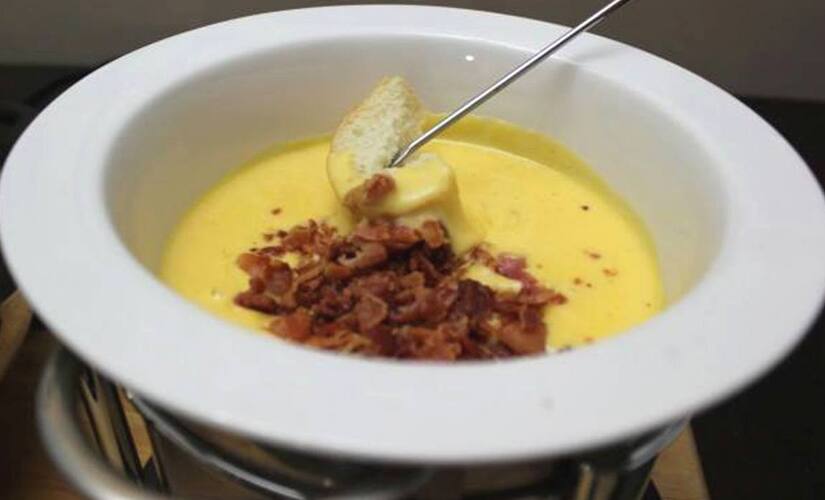 Served in a white fondue pot, this chocolate overdose is no less than a trip to heaven. The platter has two mini scoops of ice-cream, crunchies, marshmallows, crispy Belgian and Oreo biscuits, red velvet sponge and waffle sticks. All this comes with rich, luscious dark Belgian chocolate bubbling in the pot. Price: Rs 495 + taxes Bacon and Cheddar Fondue @ The Blue Door Cafe,