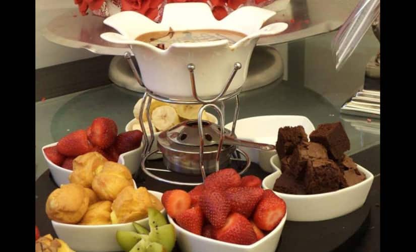 This one’s for all the coffee lovers out there; a pot of warm creamy white chocolate that has hints of mocha. Dip brownies, muffins, wafers and marshmallows for a nice delightful chocolate high. Price: Rs 349 + taxes Belgium Heaven Fondue @ Chocovault,