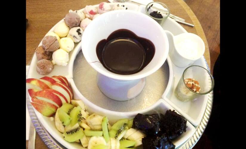The European Fondue at Haagen Dazs is as fancy as it gets. The fondue here has a platter of tiny scoops of ice-creams, thin crepes, colourful macaroons, dark chocolate brownies, small squared waffles and fresh fruits. Spear a piece of brownie, dip it in the warm melting dark chocolate and caramel sauce, and enjoy the little joys of life. Price: Rs 1895 + taxes