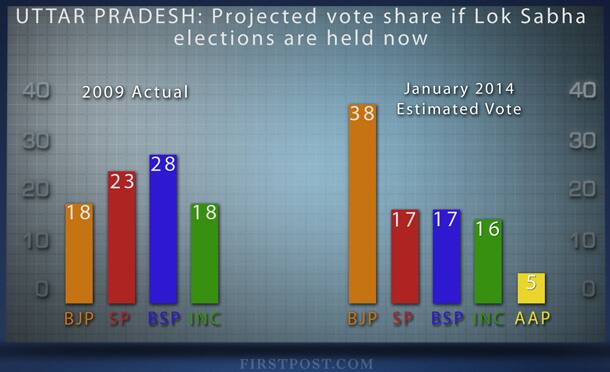 (L) BJP prime ministerial candidate Narendra Modi speaks during a election campaign rally at Gorakhpur in Uttar Pradesh on Thursday; (R) BJP supporters at the Gorakhpur election campaign rally. PTI[/caption] Dead lotus may bloom again in Uttar Pradesh What the Muzaffarnagar riots did was to make the Bharatiya Janata Party’s position stronger in Uttar Pradesh compared to the last survey in July 2013. The total sample size for 2013 was 3,284 while it is 2,834 in January 2014. The survey discovered that if the Lok Sabha elections are held now, the BJP will get 38 percent of the vote share leaving the SP and Bahujan Samaj Party way behind with 17 percent each. The Congress will be tottering at 16 percent. The jump for the BJP from the July survey has been quick and high. In a July 2013 survey, the BJP got 27 percent of the vote share while the SP and BSP got 22 and 21 percent respectively. The Congress was at 16 percent even then. When the state with 80 Lok Sabha seats, the highest in the country, prefers to to be in their bag, it is for certain that the leaders and cadres of the saffron party will wait in enlivened anticipation for the survey findings to become a reality. Muzaffarnagar riots: a cauldron of repressed anger So high has been the anger against the Samajwadi Party for the riots that 45 percent of respondents in the January survey conducted by Lokniti-IBN National Tracker blamed the party ahead of the BJP with only 13 percent. What will alarm the SP top brass more is that 24 percent of the Muslim sample size of 1,805 are unhappy with the party while another 34 percent are displeased with the BJP. The loss of faith among the Muslim community at such a politically significant time will prove costly for the ruling party in the state. Brickbats both for the Centre and the state government are also in offer from the Muslim community for the insensitive handling of the Muzaffarnagar riots. A whopping 51 percent each among the Muslim respondents are dissatisfied with both the governments for their lapses. Perhaps because of the recency of the Muzaffarnagar riots the dissatisfaction with the Uttar Pradesh government has dramatically risen in the last six months. From 32 percent in 2013, it shot up to 41 percent in 2014, as per the survey reports. The satisfaction has also fallen a single percent from 49 to 48. The performance of Akhilesh Yadav has not given enough reason to enthuse the SP cadres as well. Although 50 percent of the respondents are happy with him, 40 percent are unhappy. Not surprisingly, six out of 10 respondents want the SP government to go if the Assembly polls are held now. In July 2013, the anti-incumbency was at 44 percent.