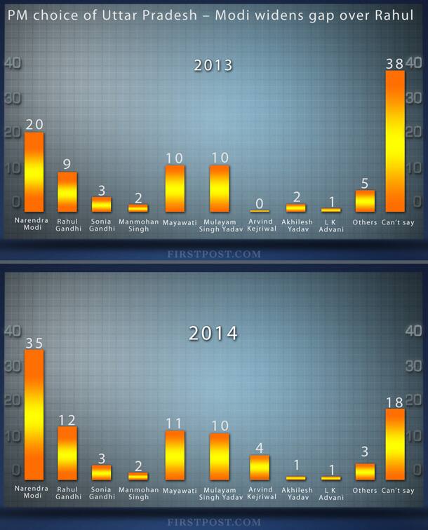 Uttar Pradesh caught by Narendra Modi wave With the 2014 Lok Sabha polls closing in, Uttar Pradesh is increasingly swaying along with the Modi breeze. The BJP prime ministerial candidate has widened the gap with his immediate challenger Congress Vice President Rahul Gandhi compared to the July 2013 survey. While today the figures stand at 35 percent for Modi, it is 12 percent for Rahul, 11 percent for Mayawati and 10 percent for Mulayam. The support for the Gujarat chief minister was at 20 percent, 9 percent for Rahul and 10 percent each for the SP and BSP chiefs in July last year. The survey found that when distributed zone-wise, Eastern Uttar Pradesh and Doab offered the highest support for Modi with 41 and 40 percent respectively. The Brahmins with 60 percent, Jats with 59 percent and Rajputs with 52 percent gave the Gujarat chief minister enough strength to go for his prime ministerial ambitions. As expected, the Muslims chipped in with the lowest support at 11 percent.