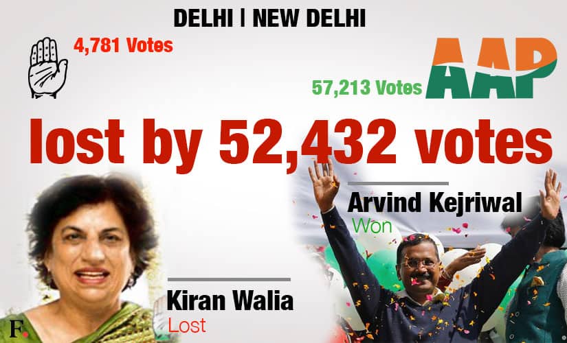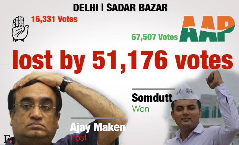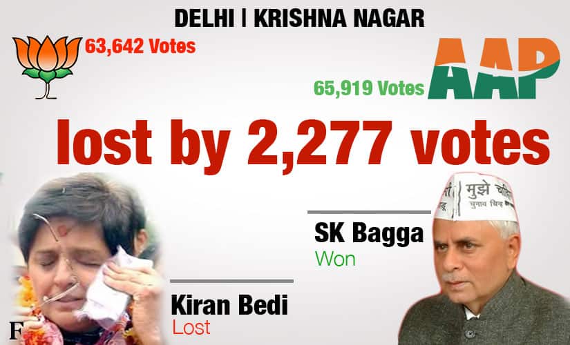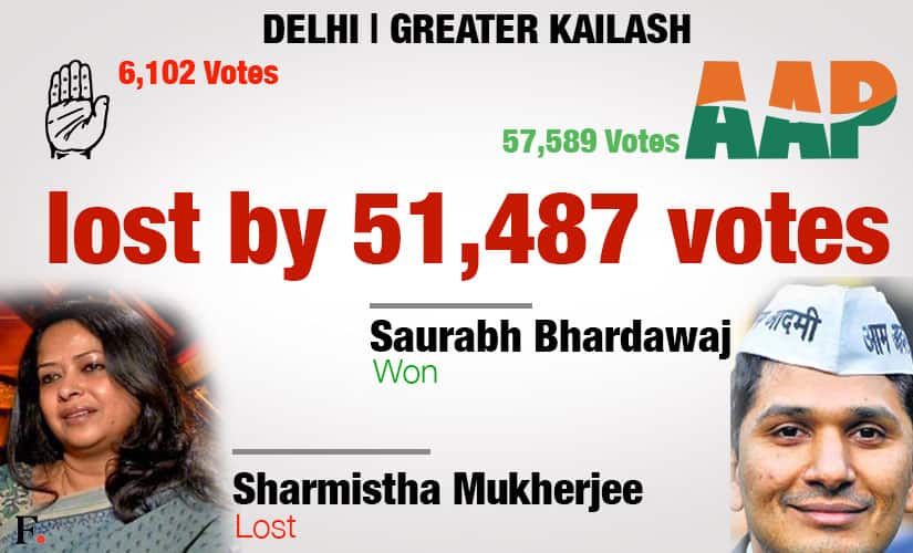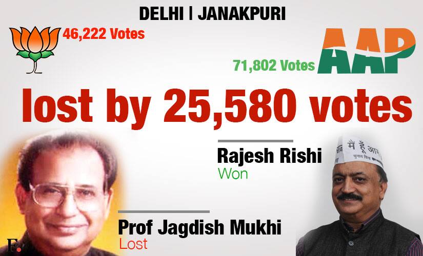 The biggest blow for the Congress was the defeat of its election campaign chief Ajay Maken. While most exit polls had predicted a 2-3 seat win for the party, they didn’t even manage a single. While Maken has now offered to resign as Congress General Secretary given his party’s disastrous performance, it would be stupid to pin the blame on the former Union minister as since the election was declared, it has always been an AAP vs BJP fight and the Congress never really featured. Interestingly, early morning on counting day, when Congress was leading in five seats, Maken quipped, “well at least we’re doing better than what the exit polls predicted.”  Jagdish Mukhi ![Big players who lost out ](https://images.firstpost.com/wp-content/uploads/2015/02/DELHI-_-JANAKPURI-.jpg)   If the BJP’s top leadership had not appointed Kiran Bedi as its CM candidate, professor Jagdish Mukhi could well have been the top contender for the post. A veteran BJP leader and an RSS man, Mukhi has been winning the Assembly seat, a BJP stronghold, since 1993. A professor at Shaheed Bhagat Singh College, Bhagat has been the Leader of Opposition in Delhi and has served the BJP in various capacities including as a member of its National Executive Committee. His defeat though comes as a massive blow to the party which now, besides being almost wiped out in the Assembly, has not formidable state party leadership as well. Mukhi lost his seat by over 25,000 votes. Kiran Walia: ![Big players who lost out ](https://images.firstpost.com/wp-content/uploads/2015/02/Kiran-Walia.jpg)   This defeat was almost certain given that it was against the AAP’s national convener Arvind Kejriwal. If Kejriwal could manage to defeat three-time Congress CM Sheila Dikshit in the 2013 Assembly elections, Kiran Walia was no match. A former minister in Dikshit’s cabinet, Walia had challenged Kerjiwal’s candidature in court raising questions about his affidavit as well as his road shows which she alleged were in violation of the model code of conduct. The Election Commission, however, stood by Kejriwal saying his candidature was valid as his name was enrolled as a voter in New Delhi constituency, as required by law. Walia, who was quite obviously trailing since counting began, managed to secure just 4,781 seats as compared to Kejriwal’s 57,213. Kiran Bedi ![Big players who lost out ](https://images.firstpost.com/wp-content/uploads/2015/02/KRISHNA-NAGAR.jpg) The BJP may have expected Kiran Bedi’s candidature and her projection as the party’s CM candidate to rope in a massive victory for the party by winning the middle class vote, but little did they expect that Bedi would go on to lose from Krishna Nagar, a BJP stronghold that has been represented by now Union Minister Harsh Vardhan since 1993. While Bedi did face some setbacks with her own election campaign chief resigning 1o days before the election, the party was certain she would come through and at least be a strong opposition voice if the party failed to get a majority. But even in defeat, Bedi was not humble. “I have not lost, the BJP has lost. They are a national party, let them introspect,” she told reporters from her residence on Tuesday afternoon. Sharmistha Mukherjee ![Big players who lost out ](https://images.firstpost.com/wp-content/uploads/2015/02/Sharmistha-Mukherjee.jpg)   A fresh face that the Congress party was hoping would work in its favour was that of Sharmistha Mukherjee, daughter of President Pranab Mukherjee, a veteran Congressman. Mukherjee, who joined the party only last year launched her campaign with a focus on Resident Welfare Associations hoping to win the vote of fellow residents. The established Kathak dancer also managed to get West Bengal Congress leaders to campaign for her candidature, hoping to win the support of the Bengali dominant Chitaranjan Park area of Greater Kailash, but to no avail. Aam Aadmi Party’s Saurabh Bharadwaj, who won in 2013 as well, managed to win with an even higher number of votes this time.
