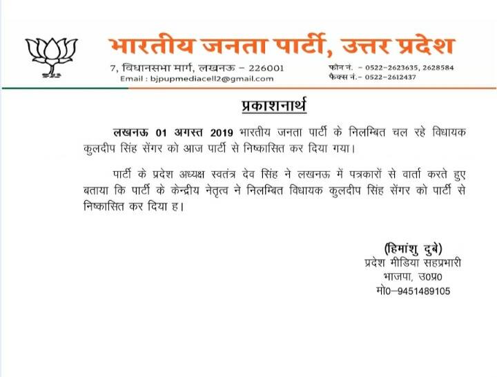 After several conflicting reports on the expulsion of Unnao rape accused and BJP MLA Kuldeep Singh Sengar, the saffron party on Thursday put doubts to rest by officially confirming that it has expelled the Uttar Pradesh legislator from the party.