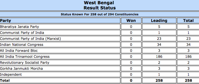 File photo of West Bengal CM Mamata Banerjee. AFP[/caption] Trinamool Congress leader Mamata Banerjee had created electoral history in 2011 when she ended the 34-year-long Communist rule in West Bengal. However, after a series of corruption scandals and allegations of political violence, her popularity is now under serious question. However, the exit polls have predicted a TMC sweep in the state. Interestingly, all exit polls predicted an anti-incumbent mood in all states except West Bengal. West Bengal’s ruling Trinamool Congress on Monday expressed happiness at being given a clear majority in the state Assembly elections by most of the exit polls. Most of the exit poll surveys by regional and national channels have given TMC a clear majority in the 294-member Assembly. Most exit poll surveys conducted by regional and national channels have given TMC a clear majority in the 294-member Assembly. “We will wait for 19 May and the actual results. The people of Bengal will bless Trinamool abundantly. The Mamata Banerejee government’s peace and communal harmony will win the hearts and minds of the people of Bengal,” TMC spokesperson Derek O’Brien said. On the other hand, the opposition combine of the Left Front and Congress is hopeful of the formation of an alliance government. CPM MP Ritabrata Banerjee and Congress leader Abdul Mannan said that whatever might be the exit poll prediction, the formation of the alliance government was “imminent.” Mannan claimed people had voted in favour of the alliance.