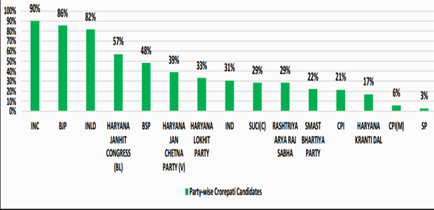 Did you know that the number of crorepatis contesting in Haryana assembly polls have risen from 32 percent in 2009 to 42 percent in 2014? The Association for Democratic Reforms (ADR) has analysed the affidavits of 1343 candidates contesting for the Haryana assembly polls and found that the number of crorepatis have risen from 380 in 2009 to 563 in 2014. Here are some interesting financial details: 1. Out of 1343 candidates, 122 candidates declared assets worth more than Rs 10 crore against 41 candidates from the previous Haryana Assembly elections in 2009 2. 90% out of 90 candidates in INC were crorepatis, 77 (86%) out of 90 candidates in BJP are crorepatis, 72 (82%) out of 88 candidates in INLD are crorepatis. You can view the entire percentage of party wise crorepati candidates in the table below: [caption id=“attachment_1749079” align=“aligncenter” width=“620”]