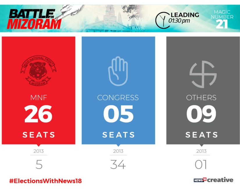 The Mizo National Front (MNF) is all set to capture power in Mizoram after a decade, having established leads in 25 of the 40 assembly constituencies, while the ruling Congress is ahead only in places, reports News18. Mizoram is the last bastion of the Congress in the northeast that comprises eight states, including Sikkim. The ruling Congress is leading in only six constituencies and trailing in almost all the other constituencies, which it had won in the 2013 polls. The Bharatiya Janata Party (BJP) is heading ahead in one constituency. In the 2013 elections, the Congress had won 34 seats, while its main Opposition, the Mizo National Front (MNF), got five and the Mizoram People’s Conference bagged one seat. The Congress and the MNF have ruled Mizoram since 1987. The BJP also has set its eyes on the state this time as all other northeastern states are now ruled either by the saffron party or others supported by it. Sikkim’s ruling Sikkim Democratic Front (SDF) is also friendly with the BJP. No party in the state has so far been able to form governments thrice in a row since 1987 when Mizoram became a full-fledged state. The Congress and the MNF fielded 40 candidates each while the BJP contested in 39 seats. The Zoram Peoples Movement (ZPM), an alliance formed by two political parties and four groups, also contested in 35 seats. With inputs from PTI Follow all the latest updates from the Telangana Elections here Follow all the latest updates from the Mizoram Elections here Follow all the latest updates from the Chhattisgarh Elections here Follow all the latest updates from the Madhya Pradesh Elections here Follow all the latest updates from the Rajasthan Elections here Follow Firstpost’s coverage of the 2018 Vidhan Sabha Elections here