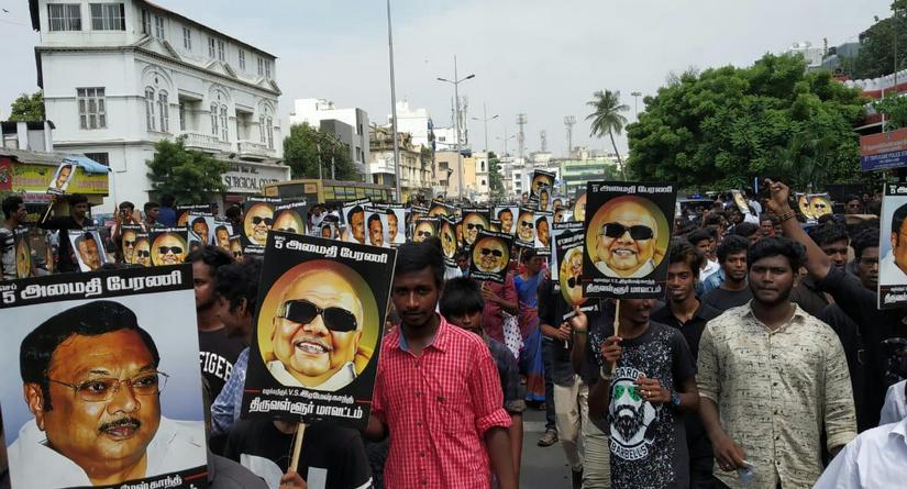 MK Alagiri rally LATEST updates: Alagiri and his elder daughter paid floral tributes at the Karunanidhi memorial. K Isakkimuthu, former zone chairman of Madurai Corporation and a friend of Alagiri’s said that he had hope more supporters would show up at the march to show their strength. He expressed concern about how few people had come. The Alagiri faction had been telling local media that 1 lakh people will come. But party insiders were expecting at least 50,000 against the 20,000 who are reported to have joined the march Thousands of Alagiri supporters have reached the Marina beach at Karunanidhi’s memorial. The supporters will pay homage to the former DMK chief. IAS officer Sagayam, who is overseeing arrangements at Alagiri’s roadshow, says that close to 20,000 people have entered through the city checkposts. At least, 12,000 people are at the rally and another 3,000 expected at Karunanidhi’s samadhi. Expelled-DMK leader Alagiri kickstarted the roadshow in Chennai an hour late. The silent rally marking the 30th day of the death of Karunanidhi has reached Madras University and is proceeding towards the former chief minister’s memorial at Marina Beach. Chennai Traffic Police has diverted traffic from Anna Salai from 9 am towards adjoining roads. A police official says that Alagiri and his team of supporters had taken permission to start the rally at 10 am but are an hour late. This is continuing to cause traffic snarls. Alagiri is yet to reach the venue. The Chennai Police is prepared with ropes and barricades near Chepauk Stadium to ensure that the marchers stop here. The authorities have not granted Alagiri the permission to hold a march till Marina Beach. An interesting development in DMK succession politics is that while Alagiri has diluted his stand to accept Stalin’s leadership, the latter has maintained a tough stance. The DMK on Tuesday acted strongly against a party functionary for welcoming expelled DMK leader MK Alagiri at the Chennai airport, suspending him for “bringing disrepute to the party”. Expelled DMK leader MK Alagiri’s supporters said that the party must pay heed to their demands. One of Alagiri’s aides said that they do not seek any particular position in the party but merely a presence. A substantial crowd has come out in support of Alagiri. Alagiri’s son Dhaya Azhagiri has confirmed that after a public address the congregation will march till the Karunanidhi memorial at Marina beach, where they will pay their respects to the late DMK leader. Expelled DMK leader MK Alagiri will hold a rally on Wednesday to pay homage to his father, M Karunanidhi who died on 7 August. However, the rally, scheduled to begin at 10 am is touted as a show of strength by his supporters as the late DMK chief’s elder son hinted that he will not go down without a fight. [caption id=“attachment_2963308” align=“alignleft” width=“380”]