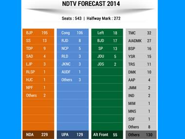 BJP prime ministerial candidate Narendra Modi is almost there but not quite — and this shortage if not plugged timely, may pose a real threat to Modi’s prime ministerial dreams. Former The Hindu editor N Ram puts it aptly. “BJP under Modi may face a last mile problem. They might not enough seats as the UPA had got 262 in 2009.” [caption id=“attachment_1435297” align=“alignleft” width=“380”]  Elections start in April. AFP[/caption] According to a survey carried out by the Hansa Research Group for NDTV, the NDA is likely to get 229 seats while the UPA is likely to win 129. The survey gave alternate front 55 seats and the others got 130. Significantly, the others include parties like Trinamool Congresss and the AIADMK. Independently, the BJP is likely to get 195 seats and the Congress 106. Before the complete picture was given, a few of the key states were also analysed. UTTAR PRADESH With 80 seats, the country’s biggest state Uttar Pradesh is the largest pie, which every political party will want to have. But having the largest bite is not so easy as the BJP may seem to make it in the forthcoming Lok Sabha elections. CLICK HERE for the first part of the opinion poll that NDTV carried out recently: BJP way ahead of Cong in Madhya Pradesh, Rajasthan, says survey. Senior journalist Sharat Pradhan, “Muslims are disillusioned with Mulayam Singh Yadav and the Muslim votes are drifting towards the BSP. But is Modi winning over the moderate Hindu shedding his Hindutva image.”. [caption id=“attachment_1435235” align=“alignnone” width=“300”]  Source: NDTV[/caption] Columnist and author Sudheendra Kulkarni said, “Spectacular performance by the BJP with a jump from 10 (2009) to 40 seats. This result could propel the BJP to a winning position at the Centre.” Seat tally Total number of seats: 40 BJP - 40 (+30) BSP - 15 (-5) SP - 13 (-10) Congress+RLD - 12 (-14) PUNJAB The BJP still has a lot more to do to beat the Congress in the state where parliamentary elections are concerned. As per the survey, the results are more or less similar to that of 2009. Kulkarni said, “Repeat of results is happening due to the fact that the BJP is not very much united in the state.” Seat tally Total number of seats: 13 Congress - 8 BJP+SAD - 5 ASSAM When it is Assam, it is Congress all the way as the party is likely to raise its tally from seven in 2009 to 13 this year. The Indian Express editor-in-chief, Shekhar Gupta said, “People of Assam are angry with AGP as the people in West Bengal disdain Left. It will really take somebody to defeat the Congress.” Kulkarni said, “The BJP is not united in Assam. They had to appoint former AGP leader Sarbananda Sonowal as its president.” Seat tally Total number of seats: 14 Congress+AIUDF: 13 BJP: 0 AGP: 0 Other: 1 ODISHA The rise of Chief Minister Naveen Patnaik is evident with the manner the BJD is going to perform in the next polls. Increasing its tally from 14, the party is likely to grab three more seats to make it 17. On the other hand, the survey showed that the Congress is losing three seats, which means they’ll have three less than its tally in 2009 (6). Seat tally Total number of seats: 21 Biju Janata Dal: 17 (+3) Congress: 3 (-3) BJP: 1 (+1) SEEMANDHRA For a new party like YSR Congress, it is a kill with the Jagan Mohan Reddy-led party likely to win 15 seats out of 25. On the BJP-TDP alliance, political analyst K Nageshwar said, “TDP is looking for a long term relationship with the BJP. They have realised that they would have to go for a post-poll alliance anyway with the BJP, so why not a pre-poll one.” Seat tally Total number of seats: 25 YSR Congress: 15 (+15) BJP+TDP: 9 (+5) Congress: 1 (-20) TELANGANA The Congress won’t be too happy to see its tally in the state. By going out all out to create the state of Telangana, the party had hoped for some big electoral dividends but the TRS is appearing as the spoiler. Nageshwar said, “The number of seats TRS is getting in Telangana will be won by itself even without an alliance with the Congress. So the TRS doesn’t want to subscribe to the UPA immediately.” Kulkarni said, “BJP is losing both in Seemandhra and Telangana. Congress has hurt itself much in Seemandhra without much gain in Telangana. Also there is no pre-poll alliance with the TRS.” Seat tally Total number of seats: 17 TRS: 11 (+9) Congresss: 5 (-9) Others: 1 (-2) KERALA India’s southernmost state has very little to offer to the BJP but the Congress could make some gains in the form of UDF as per the survey. India Today, associate editor, MG Radhakrishnan said, “Because of the Modi factor there is a consolidation of support for the UDF from the minorities which is giving it an edge over LDF.” Seat tally Total number of seats: 20 UDF: 13 (-3) Left: 7 (+3)