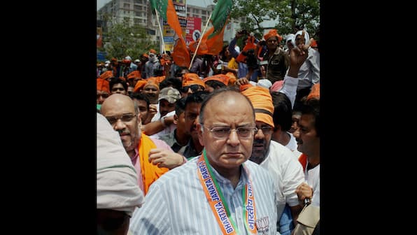 BJP leaders Arun Jaitley and Amit Shah protest against the EC in Varanasi after the Narendra Modi was refused permission to hold an election rally there. PTI photo.