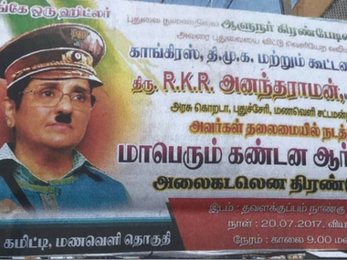 The political tussle between Puducherry Lieutenant-Governor Kiran Bedi and the Congress government reached a new level when Bedi on Thursday tweeted the image of a poster in which she had been portrayed as Adolf Hitler. According to News18, Bedi alleged that the local Congress unit was behind the poster as part of its “condemnation agitation against the central government and the Lt-Governor” for the process of nominating MLAs. The image in the poster showed Hitler’s trademark toothbrush moustache superimposed on Bedi’s face. Bedi tweeted the poster with an emoticon of folded hands.