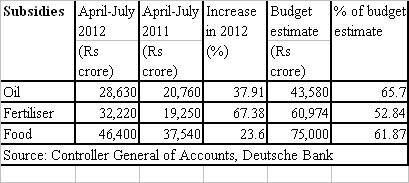 As we have said repeatedly, the fiscal deficit target of Rs 5,13,590 crore, or 5.1 percent of the gross domestic product(GDP) for 2012-2013. This will happen primarily because the subsidy bill is going through the roof (see table below).