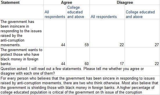 The constituency that thought highly of Manmohan Singh in 2009 — the educated and the literate — no longer thinks highly of his UPA government. In fact, the core message coming through from a CNN-IBN State of the Nation Survey is just the opposite: the UPA’s corruption stinks. The survey, conducted by Centre for the Study of Developing Societies (CSDS) from 1,300 locals in 19 states, confirms that corruption has become a big deal with the aam aadmi, both in urban and rural areas, but more so among the educated classes. A decisive 60 percent of those surveyed felt that the UPA was running a “Very corrupt” or “Somewhat corrupt” government, with urban respondents showing an even higher percentage of disgust at 66 percent. That’s two out of three people. College-educated people were most vehement and angry, with as many as 71 percent agreeing with the above statements. This is the group from where Team Anna probably finds sustenance. [caption id=“attachment_57588” align=“alignleft” width=“380” caption=“The constituency that thought highly of Manmohan Singh in 2009 — the educated and the literate — no longer thinks highly of his UPA government. B Mathur/Reuters”]  [/caption] Rahul baba, you have a problem on your hands in 2014. Manmohan Singh_ji_, your credibility has been shot to pieces — especially on corruption. But Gadkari_ji_, Sushma_ji and_ Jaitley_ji_, you have nothing to gloat about. Karnataka is the only state where the people are more concerned about the BJP’s corruption than the UPA’s by a huge margin. You did well asking Yeddyurappa to go, but you have a huge repair job to do. Interestingly, corruption is a wider issue than the current media obsession with the 2G and Commonwealth Games scams. The survey finds 44 percent of the people agreeing with the statement that “The government has been insincere in responding to issues raised by the anti-corruption movements”, but barely 27 percent of the respondents had heard of A Raja and 25 percent of Suresh Kalmadi. Even fewer (22 percent) had heard of Kanimozhi or Dayanidhi Maran (19 percent). What this suggests is that the recent incidents of corruption may merely have upped the ante on corruption, but the aam aadmi has more serious concerns about corruption and it goes well beyond the 2G or Commonwealth scams. Perceptions about central- and state-level corruption also tell the same story. Despite the public’s strong unhappiness with UPA’s poor record on corruption, in many states the concerns are about both central and state corruption. In Karnataka and Andhra, state-level corruption seems like a bigger problem than the UPA’s distant corruption. Dilli door ast. In Karnataka, for example, 52 percent of the respondents felt that the state government was more corrupt than the Centre, against just half the number who said the Centre was more corrupt. In Andhra, the anger with state-level corruption was 39 percent against 32 percent for the Centre. Rahul Baba, here’s a tit-bit for you. In Uttar Pradesh, where you are trying to score points over Mayawati, both Centre and state are seen as nearly equally corrupt (at 32 and 30 percent). So maybe you should not make corruption a key talking point. In Bihar, there is an even more interesting trend: while UPA is seen as corrupt (48 percent) and the state government as a near angel (just 14 percent), the real problems are at the level of local governments – panchayats and zilla parishads. Here the corruption score is 37 percent. Nitish Kumar_ji_, this is your next challenge. Your panchayats are your Achilles’ heel. Surprisingly, Sheila Dikshit’s government has emerged unscathed, with only 20 percent saying it was more corrupt than the Centre. Or is it luck at work, with people associating the Commonwealth scam squarely with Kalmadi and the Centre? Given these perceptions, and given the strong antipathy of the educated and literate classes to corruption, it is little wonder that Team Anna is finding traction. But there is a humbling thought for them, too: only a third of the people polled in 1,300 locations had heard of them, and only one-fourth knew what the Lokpal and Jan Lokpal Bills were about. But so low is the trust in politicians, and especially the UPA government at the centre, that people implicitly trust the civil society movement more. The Tina (there is no alternative) factor is helping Anna Hazare more than anything else. Table 1:UPA government insincere on corruption [caption id=“attachment_57476” align=“alignleft” width=“552” caption=“Table 1: UPA government insincere on corruption.”]  [/caption] Table 2: UPA running a corrupt government [caption id=“attachment_57537” align=“alignleft” width=“557” caption=“UPA is running a corrupt government.”]  [/caption] Table 3: Centre most corrupt [caption id=“attachment_57486” align=“alignleft” width=“487” caption=“Table 3: Centre most corrupt.”]  [/caption] CNN-IBN CNBC-TV18 State of the Nation Poll in association with Forbes India conducted by CSDS.