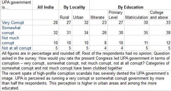 A CNN-IBN survey conducted by the Centre for Study of Developing Societies shows corruption is a major concern, and the UPA is seen as being insincere on this front.