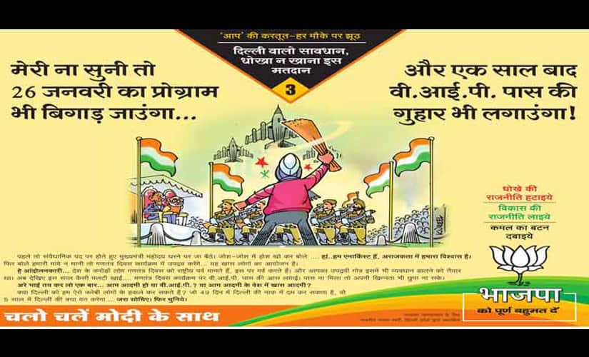After repeated attacks from AAP, the BJP published advertisement taking digs on Kejriwal. It showed Kejriwal holding a broom saying, “Meri na suni toh 26 January ka programme bhi bigad jaunga. Aur ek saal baad VIP pass ki bhi guhaar lagaunga (If you don’t listen to me I will spoil the 26 January programme and a year later I will also demand VIP passes.)” Criticising Kejriwal the ad went on to say, “Desh ke karodon log gantantra divas ko rashtriya parv mante hain, us par garv karte hain. Aur apka updravi gotra isme vyavdhan dalne ko taiyar tha (Crores of people in our country consider Republic Day as a national festival and are proud of it. But your troublemaking community is ready to disrupt it.)” Taking offence to this, Kejriwal took to Twitter to hit out at the BJP. He said, “What has happened to the BJP? First they targetted my children. But I kept quete. Annaji has said one has to have the ability to digest insults. I have never reacted on personal attacks. But the BJP crossed a line in today’s ads. They have called the whole Aggarwal community troublemakers, they have called my community a trouble making community.”