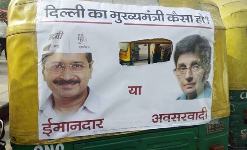 The Aam Aami Party put out posters behind Delhi auto rickshaws last week asking the question: Dilli ka mukhyamantri kaisa ho? (How should the Delhi CM be?). Below it were the faces of Kejriwal and Bedi. While below Kejriwal it said Imandar (honest), below Bedi it said avsarvadi (dishonest). This advestisment left Bedi fuming even as she sued Kejriwal over using her photo without permission and calling her an opportunists.