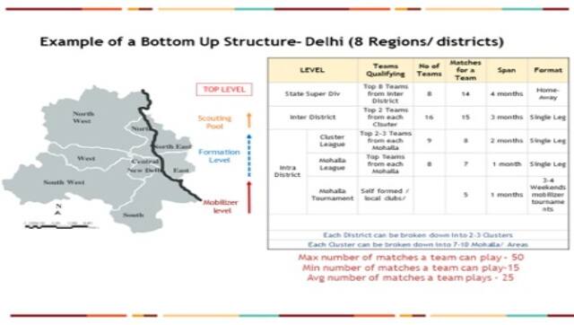 1. Ease entry barriers for new initiatives, support them in building capacity and sustainability. Have a program in place by state Football Associations for incubation programs rather than charging hefty affiliation fees. The entry barriers for state and local leagues are too steep for smaller outfits who want to participate and test themselves at the highest level. State associations demand exorbitant sums (upto Rs 10 lakh) for affiliation. This is done, to ensure that newer members do not have voting rights. By having smaller outfits enter at the base level and charging them only the competition fee, the states stand to gain from a larger player pool and increased game-time. 2. Liason with government, SAI and academies to maximise infra utilisation, thus benefiting both ends in terms of increased revenues and lower unit cost respectively. The step to privatise certain sections of public infrastructure is a welcome one. The next step is to ensure that the infrastructure is widely accessible to all interested parties. The current turf culture in metropolitan cities mean that free spaces to play are dwindling. The quality and nature of these turfs mean that they are an attractive proposition to the financially well-off. For a women’s team though which may have a budget of less than 10 lakh to last a year, it becomes difficult to train round the year. The booking of turfs these days cost you a minimum of 1,000 rupees an hour (with some exceptions). For a team wishing to have 100-150 training hours in a year, the cost of training throughout the year may go up to Rs 2-3 lakh a year, assuming a squad of 25 and two-hour training sessions. A mapping of unutilised hours and opening them up at a lower cost to institutions in need may benefit all parties. 3. Increase the player pool: Have at least a 3-tier league structure with 35 games/ 2,500 minutes ensured for a player from U7 to U20 and for seniors 45 games/ 3,500 mins through zonal, state matches A visual explainer might come in handy here.