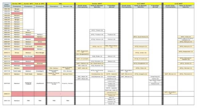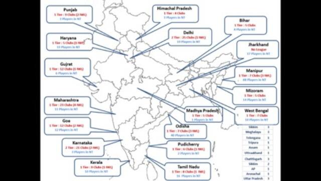 — STATE WISE STATUS OF DOMESTIC LEAGUES Map Legend: — 1 Tier: 10 clubs: The state league is a single tier in format and seven teams have participated across editions held over last four years (2018-19 onwards) — 2 IWL: 2 unique teams have participated in IWL across four editions — 2 players in NT: 2 players from the state have been in the national team or national camp across age groups (including U16, U17, U19 and Seniors). The data captures squad lists from 2013 — till date A worrying sign here is that Manipur, Odisha and Haryana contribute approximately 60 per cent of the national team players. Out of 300 players mapped to NT squads since 2013, one-third of national team representation is from Manipur. The other states are playing catch-up and haven’t produced enough players to close this gap. Since all players called for a camp don’t get selected for the NT, we assume that 20 per cent get eliminated post-camp which mathematically implies that India had 250 unique players across three NT age-group teams in the last nine years. If we further assume a squad (of 25) rolling overhaul every four years, then all these three teams (U16, U19, Seniors) don’t have backup/options. A zonal stage between the state leagues and the national league is an interesting concept. This provides more matches for the best teams in zones, thus eliminating the need for more airfare, longer hotel bookings and higher cost-to-gametime ratio. Zone wise: 1. Delhi-Haryana-Punjab-Himachal have 43 clubs 2. Karnataka- Kerala- Puducherry-Tamil Nadu- 44 clubs 3. Maharashtra-Goa-Gujarat- 47 clubs 4. Manipur-Mizoram- 12 clubs 5. West Bengal-Odisha-Jharkhand-Bihar -19 clubs