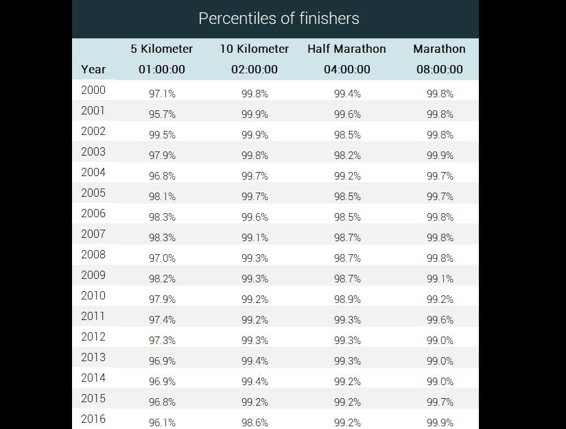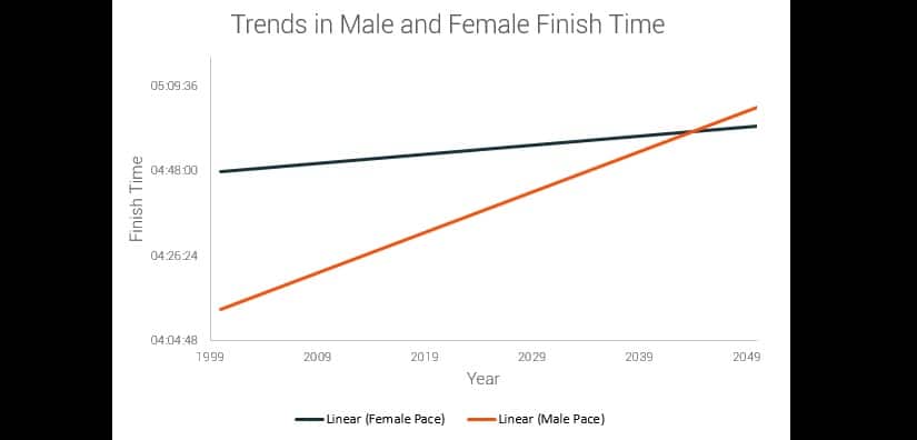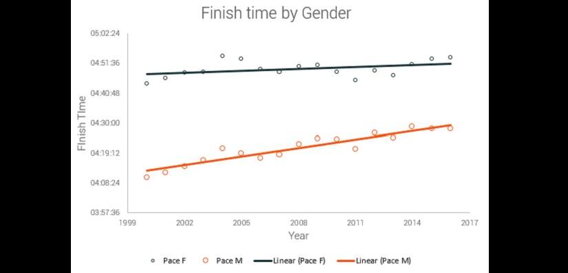 “Women are mostly shorter, with shorter legs. Our centre of gravity is lower, so to avoid injury we take smaller strides. Women also consider the possibility of osteoporosis. Also, our legs are heavier compared to men with similar height and weight. Our lung capacity is also different and so on,” explains Nikolova. People I talked to say that the physiological differences play smaller role here, because it differs from person-to-person, rather than gender-defined. For example, a recreational runner since 2007, 58-year-old Mary Post finds summer heat and exercise-induced-asthma as her biggest struggles. She dropped back in her age group in Fremont, Ohio’s Camelback 10K run in which she came first the year before, because it was extremely hot. “I accept my limitations. I know I do not perform well in the summer heat so I do my best and take it into account,” she says. Like everything, marathon running is a neat combination of training, preparation, skill and the cards you are dealt as body shape and genetics, believes Nikolova. Post agrees, saying that many factors like weather conditions, outdoor temperature, time of day, nutrition, sleep, hydration, energy level, stress etc come into play. As for social prejudice or negativity that women might feel on the ground, Solkin tells of the time in 1998 when she was taking classes to earn her Level 2 certificate from USA Track and Field, which is a national governing body for the sports. She felt disrespected by fellow colleagues because she was one of the few female coaches at the time, and because she was developing her own business by becoming a club coach, and not a high school or college sports teacher, or training competitive or elite runners which was a more popular choice then. “It was discouraging at the time, I did not appreciate it,” she says. “But I am an entrepreneurial person, so I did not let it stop me. I moved forward,” she says, taking credit for starting club coaching in America which did not exist before (it is coaching for people who are not in school, and aren’t professionals, but fitness runners). Nikolova says that linear trends have their inherent limitations; and are most useful for only short to mid-term predictions. “For the long term they provide interesting considerations and thinking points, but shouldn’t be taken too seriously – nothing in life goes up or down forever.” With regards to the myth that there is an increase in people with inappropriate fitness level who just walk the race, the proportion of “runners” finishing slower than with the average walking pace is rather consistent over the last 16 years.