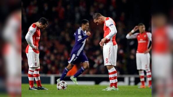 A remarkable late collapse scuppered Arsenal’s hopes of qualifying early for the Champions League last 16 as Aleksandar Mitrovic’s 90th-minute goal earned Anderlecht a deserved 3-3 draw in Group D on Tuesday. A win would have ensured a place in the knockout rounds for the 15th season in succession and Arsenal appeared home and dry with fine goals by Alexis Sanchez and Alex Oxlade-Chamberlain building on Mikel Arteta’s 25th-minute penalty. But Anderlecht, deprived of three points a fortnight ago when Arsenal struck twice late on for a 2-1 victory, produced a late sting on a rainy night in north London, scoring three times in the last 29 minutes to keep alive their remote hopes of progressing. Anthony Vanden Borre began the salvage job in the 61st minute before he converted a penalty to induce jitters in the home crowd. Substitute Mitrovic’s late header then completed an astonishing comeback for Besnik Hasi’s youthful side. [caption id=“attachment_1788461” align=“alignleft” width=“380”]  Arsenal’s Santi Cazorla, left, and Lukas Podolski react after Anderlecht’s Aleksandar Mitrovic scored his side’s third goal. AP[/caption] After seeing the door to the knockout rounds slammed shut, Arsenal can now realistically only hope for the runners-up spot as they have seven points to the 12 of Borussia Dortmund with two games remaining. Belgians Anderlecht have two and Galatasaray prop up the table with one. “We showed today we come from a small competition but we showed for the second time we can compete with these type of teams and in two games we deserve more than one point,” coach Hasi told reporters after spending time on the pitch saluting his celebrating fans. Arsenal boss Arsene Wenger accused his side of assuming the job had been done. “We had some bad luck, the first goal was offside, but we had a lack of concentration and thought the game was won,” the Frenchman said. “Overall we were poor defensively from the first to the last minute. At 3-2 you have to secure yourself and we were not cautious enough. “It was very poor defending. Am I angry or disappointed? Both,” said Wenger. On a chilly, damp night it was Anderlecht who enjoyed the better of the opening stages with their quick interchanges causing several anxious moments in the home rearguard. Arsenal were sloppy in possession and Dennis Praet, who was on the books of the north Londoners as a teenager, nearly scored on the counter-attack with a shot that spun wide after a hefty deflection off Gunners defender Per Mertesacker. It was a warning shot for Arsenal and they were given another scare a few minutes later as the Belgians sprung forward again in menacing fashion. SUPERB TACKLE Arsenal’s first real chance saw Aaron Ramsey denied a certain goal when his shot from a Sanchez pass was blocked by a superb last-ditch tackle. The hosts were playing a dangerous game though and Anderlecht looked more than capable of capitalising with Sacha Kljestan forcing a sharp save from Wojciech Szczesny. Arsenal’s opener then came out of the blue. Danny Welbeck tussled with Chancel Mbemba in the area and when he went crashing to the ground, referee Clement Turpin pointed to the spot. Captain Arteta, who later went off with a hamstring injury, coolly dispatched the penalty to bring up Arsenal’s 500th goal in the Emirates Stadium. A few minutes later Chilean marksman Sanchez grabbed his 10th goal since joining from Barcelona in the close season, lashing a ferocious right-foot drive past Silvio Proto after his initial free kick hit the wall and rebounded back to him. When Oxlade-Chamberlain went through to slide in Arsenal’s third goal after 58 minutes it appeared to be game over – but Anderlecht were not finished. Three minutes later a suspiciously offside-looking Vanden Borre converted from close range and the bearded defender gave the visitors real hope when he slotted home a 73rd-minute penalty after Nacho Monreal wrestled Mitrovic to the ground. Re-energised, Anderlecht had a couple of late opportunities, the best of which fell to Frank Acheampong as his fierce shot grazed the top of the crossbar. Just when Arsenal were breathing a sigh of relief, Andy Najar’s cross was glanced in by Mitrovic to send the visiting fans behind the goal wild with delight. Reuters