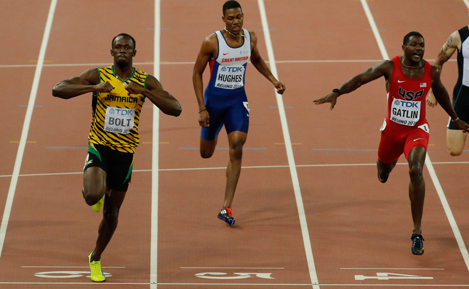 Usain Bolt Jamaica (L) celebrates winning the race ahead of Justin Gatlin of U.S. (R) who finished in second and Zharnel Hughes of Great Britain in the men’s 200 metres final during the 15th IAAF World Championships at the National Stadium in Beijing, China August 27, 2015. REUTERS/Fabrizio Bensch