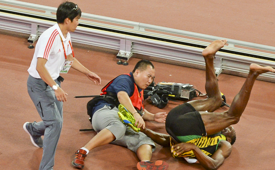 Bolt was later hit by a cameraman (C) on a Segway as he celebrated his win. It was an accident obviously, but the Jamaican came off without any injury.