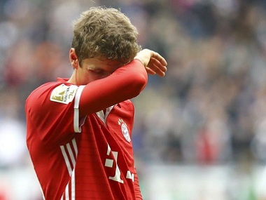 German Bundesliga leaders Bayern Munich twice surrendered the lead in a 2-2 draw at 10-man Eintracht Frankfurt on Saturday and Borussia Moenchengladbach missed two penalties in a goalless draw against Hamburg SV. Gladbach also hit the post in an astonishing match against opponents who played for more than one hour with 10 men after Cleber was sent off. [caption id=“attachment_3054486” align=“alignleft” width=“380”]  Bayern Munich striker Thomas Mueller. Reuters[/caption] Anthony Modeste, the league’s leading marksman, scored two more goals to give Cologne a 2-1 win over basement side Ingolstadt, taking his tally to seven and lifting the Billy Goats to second place, two points behind Bayern. Arjen Robben gave Bayern an 11th-minute lead at Eintracht but the hosts levelled two minutes before halftime when Szabolcs Huszti fired past Manuel Neuer for his team’s first goal against the Bavarians since 2011. Joshua Kimmich put Bayern back in front from a corner in the 62nd minute, and the hosts were in more trouble when Huszti was sent off for a second yellow card. But Frankfurt levelled in the 78th minute when Marco Fabian turned in Timothy Chandler’s cross shot with his chest as a frustrated Bayern team, who won their first five games, drew for the second match in a row. Gladbach seemed to be in the driving seat when Hamburg’s Brazilian defender Cleber gave away a penalty and was sent off in the 25th minute, but Andre Hahn’s spot kick was brilliantly saved by Rene Adler. The Foals won a second penalty on the hour after Douglas brought down Ibrahima Traore and this time Lars Stindl took the kick but sent his effort against the crossbar. Adler denied Fabian Johnson and Oscar Wendt hit the post for the Foals as Hamburg, one place off the bottom, picked up only their second point of the season in unlikely circumstances. Modeste scored twice in a 11-minute first-half spell, the second from a penalty, to set up Cologne’s win although there was a nervous finish after Lukas Hinterseer pulled one back for Ingolstadt, also from a penalty, late in the game. There was another penalty at Hoffenheim where Andrej Kramaric converted in the 81st minute to give Hoffenheim a 2-1 win over promoted Freiburg. Augsburg held Schalke 04 1-1 in the other afternoon kickoff.
