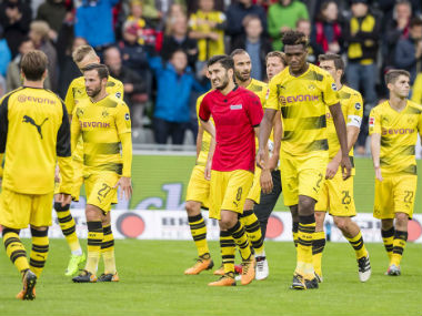 Berlin: Borussia Dortmund stuttered to a frustrating goalless draw at 10-man Freiburg in the German Bundesliga on Saturday ahead of their midweek Wembley clash against Tottenham Hotspur. Dortmund face Spurs at London’s iconic stadium on Wednesday in a high-profile opening Champions League group stage match. [caption id=“attachment_4026935” align=“alignleft” width=“380”] Borussia Dortmund players after the goalless draw at Freiburg. Twitter: @BVB[/caption] It was the first time in three games that Dortmund dropped league points under new head coach Peter Bosz. Dortmund’s star-studded attack, boasting last season’s top-scorer Pierre-Emerick Aubameyang, was denied by a stubborn Freiburg side who played for an hour with 10 men at their Schwarzwald Stadion. The video assistant referee intervened as Yoric Ravet was dismissed with 30 minutes gone. Ravet was initially shown a yellow card for a tackle on Dortmund captain Marcel Schmelzer, but the VAR overruled the referee who changed it to a red as replays showed the midfielder went in studs up. Schmelzer was stretchered off and was taken to hospital, while defender Marc Bartra was also injured in the first half. It was the first time the VAR, which is being trialled in the Bundesliga, had called for a red card in Germany’s top flight. Dortmund’s new signing Andriy Yarmolenko came on for the final 11 minutes for his debut after joining from Dynamo Kiev. The result in Freiburg means defending champions Bayern Munich can top the table by winning at Hoffenheim later on Saturday. Ghana midfielder Kevin-Prince Boateng scored his first goal in Germany’s top flight for three years as Eintracht Frankfurt won 1-0 at Borussia Moenchengladbach. After stints in Spain and Italy, Boateng slammed home his first Bundesliga goal since February 2014 with a crisp shot on 13 minutes. However, he went off concussed after a clash with Gladbach’s burly Danish defender Jannik Vestergaard. Elsewhere, Iceland striker Alfred Finnbogason hit a hat-trick in Augsburg’s 3-0 win at home to struggling Cologne. The 28-year-old struck first with a well-placed header after being left unmarked in the box, then converted a first-half penalty before slotting home in the 94th minute to claim his treble. The result left Cologne bottom after three straight defeats. New signing Abdou Diallo and midfielder Suat Serdar scored second-half goals as Mainz earned a 3-1 comeback win at home to Bayer Leverkusen. Japan striker Yoshinori Muto put Mainz level with an equaliser on the stroke of half-time after Leverkusen midfielder Dominik Kohr scored the opening goal. Diallo headed past Leverkusen goalkeeper Bernd Leno on 57 minutes, then Serdar slotted home his first goal in nearly a decade at Mainz on 71 minutes. Wolfsburg drew 1-1 with Hanover 96 after Daniel Didavi’s first-half free-kick gave the hosts the lead before Martin Harnik levelled for Hanover. History will be made on Sunday when Bibiana Steinhaus becomes the first female to referee in Germany’s top flight when Hertha Berlin host Werder Bremen. The 38-year-old will become the first female referee in one of Europe’s top leagues and Hertha are offering half-price tickets to women to see the historic moment at Berlin’s Olympic Stadium.