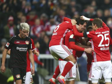 Berlin: Mats Hummels headed the winner as Bayern Munich beat Bayer Leverkusen 2-1 on Saturday to end a three-game winless streak and trim RB Leipzig’s Bundesliga lead to three points. Leipzig had gone six points clear at the summit on Friday with a 4-1 win at Freiburg, and Bayern were grateful to Hummels for heading home a Joshua Kimmich corner in the second half as they got the better of Leverkusen at the Allianz Arena to cut the deficit. Thiago Alcantara had given Carlo Ancelotti’s Bayern a first-half lead only for Hakan Calhanoglu to make it 1-1 at the break before Hummels struck. [caption id=“attachment_3128398” align=“alignleft” width=“380”] Bayern’s Mats Hummels reacts with teammates after scoring. Reuters[/caption] In the second half, Leverkusen’s Kevin Kampl and Kevin Volland both went close with late chances to equalise. The result returns second-placed Bayern to winning ways following a 1-1 draw with Hoffenheim, a 1-0 defeat at Borussia Dortmund and Wednesday’s 3-2 Champions League loss at Rostov. “It was an important win, we needed a reaction and I think we are improving,” said Ancelotti. “Every team wants to be at the top, what matters is at the end of the season, but congratulations to RB Leipzig, they are having a great season.” The win boosted Bayern, who re-elected Uli Hoeness as club president on Friday despite the 64-year-old having only finished a 21-month jail sentence for tax evasion in February. Before kick-off against Leverkusen, Hoeness apologised for having declared on Friday that RB Leipzig had joined Borussia Dortmund as being categorised as an “enemy” of Bayern. “In football – there are rivals and opponents,” Hoeness told Sky. “I’d officially like to take the word ’enemy’ back and I apologise for it.” Dortmund beaten Earlier, Dortmund were brought crashing to earth following a record Champions League win in midweek with a 2-1 defeat at Eintracht Frankfurt, who went third. It was a first defeat in 10 games for Dortmund and followed their 8-4 romp on Tuesday at home to Legia Warsaw – a record score for a Champions League game. Hungary international Szabolcs Huszti gave the home side the lead only for Pierre-Emerick Aubameyang to equalise, before Haris Seferovic grabbed the winner for Frankfurt, who are unbeaten in six league games. Dortmund coach Thomas Tuchel made eight changes to the team which started against Legia. His side was again guilty of poor defending as Frankfurt scored both their goals from restarts. “Technically, tactically, mentally and in our willingness we weren’t up to it,” fumed Tuchel. After a goalless first half, Eintracht took the lead just 16 seconds after the break as Huszti converted a Timothy Chandler cross from close range. Tuchel responded by making three changes with just over half an hour to go, bringing on Marco Reus, Ousmane Dembele and Sebastian Rode. The move initially paid off as Aubameyang headed home Dembele’s ball on 77 minutes, but from the restart, Seferovic slotted home Frankfurt’s winner before Dembele hit the crossbar in added time for Borussia. The result saw Frankfurt replace Dortmund in third and broke Borussia’s run of four straight wins. After their Champions League draw at home to Manchester City, Borussia Moenchengladbach were held to another 1-1 stalemate at Borussia Park, against Hoffenheim, to leave them winless in seven league games. Gladbach took the lead when Syrian-born Mahmoud Dahoud belted his shot into the far corner on 25 minutes, but Nadiem Amiri equalised on 53 minutes to preserve Hoffenheim’s unbeaten record this season. Wolfsburg are just two points above the relegation spots after their 1-1 draw with Ingolstadt as Anthony Jung’s goal was cancelled out by Wolfsburg’s Daniel Caligiuri. Wolfsburg goalkeeper Diego Benaglio saved a first-half penalty by Moritz Hartmann. In a thrilling north German derby, bottom club Hamburg drew 2-2 at home to neighbours Werder Bremen. Austrian international Michael Gregoritsch scored both of Hamburg’s goals either side of a Fin Bartels strike before Bremen’s Serge Gnabry made it 2-2 at the break. In the afternoon’s other game Cologne, who are fourth, were held to a 0-0 draw at home by Augsburg. Vedad Ibisevic scored both goals before being sent off in Hertha Berlin’s 2-1 comeback win over Mainz to lift his side to third in the Bundesliga on Sunday. Both teams finished with ten men for the final quarter of an hour as Ibisevic was sent off for receiving his second yellow card. His dismissal came after Mainz’s defensive midfielder Jean-Philippe Gbamin was also sent for an early shower, also for a second booking. “We stayed calm despite conceding the early goal, got ourselves level and then created the winner, so we deserved the win,” said Hertha coach Pal Dardai. Aaron Seydel had given Mainz the lead after 25 minutes at Berlin’s Olympic Stadium, but Hertha responded when Salomon Kalou spotted Ibisevic unmarked and the Bosnia forward fired home Berlin’s equaliser on 36 minutes. Gbamin was sent off on 62 minutes and his dismissal changed the course of the game. Kalou and Ibisevic combined again for Hertha’s second. Ivory Coast international Kalou headed back across goal on 67 minutes for his forward partner Ibisevic to fire home before he was sent off seven minutes later. Hertha climb to third behind leaders RB Leipzig and second-placed Bayern Munich. Earlier, Schalke 04 continued their rise as striker Eric Choupo-Moting atoned for a penalty miss by netting in their 3-1 comeback win against Darmstadt. Having been bottom of the table after losing their first five games – the worst start to a season in the club’s history – the result left Schalke eighth and unbeaten in their last 11 games in all competitions. “It’s the first time we have turned things around after going behind and we haven’t lost for a while now,” Choupo-Moting told Sky. Penalty miss Markus Weinzierl’s s