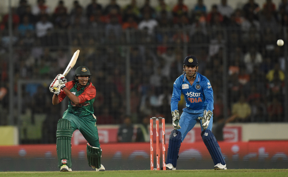 Bangladesh opener Soumya Sarkar plays a shot during his innings of 14, he was removed by the seasoned Nehra who altered the length in his last delivery onto the left-handed Sarkar, who tried to pay across the line. AFP