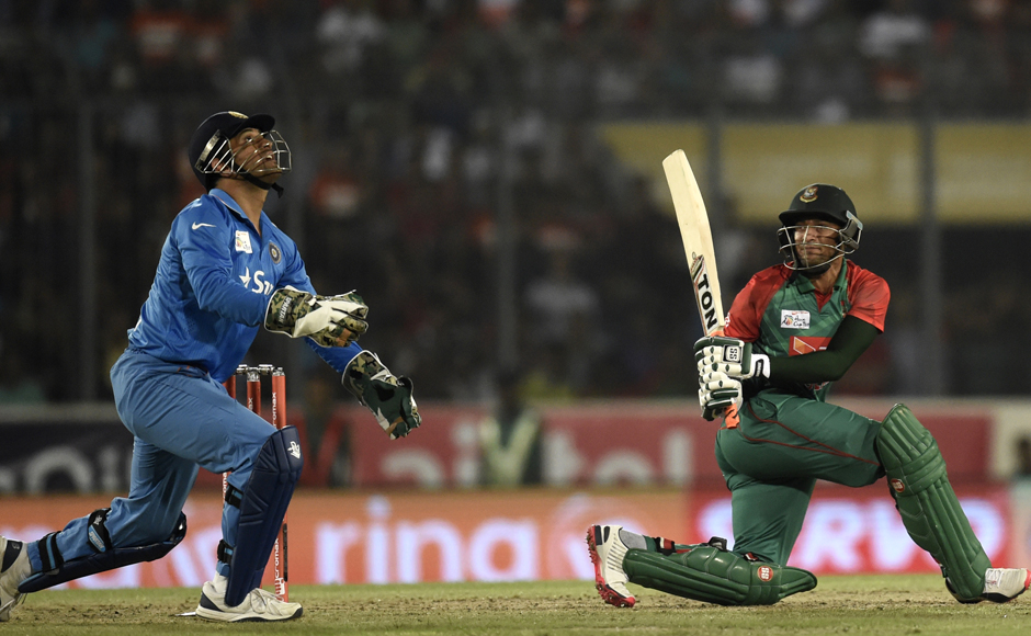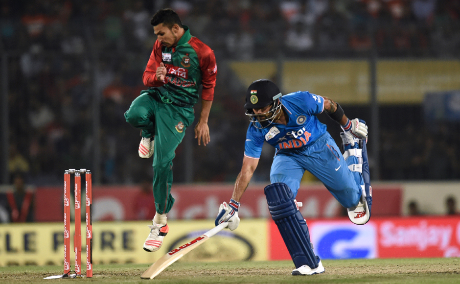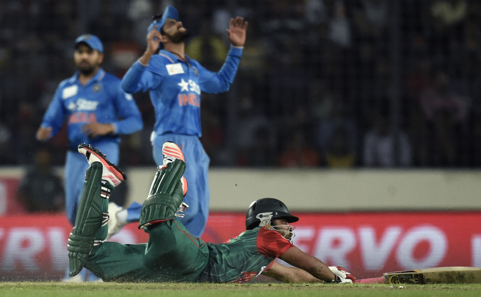 Bangladeshi cricketer Tamim Iqbal dives during a run at the Asia Cup T20 final. He was out for 13 when he tried to play across the line, and was caught plumb in front of the wickets. AFP