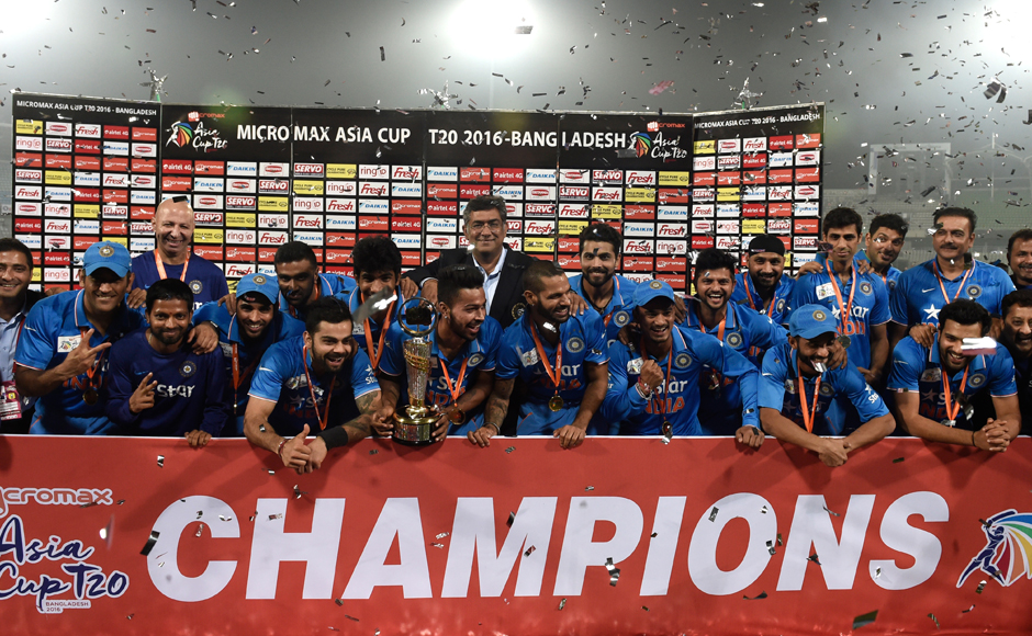 We are the champions: The victorious Indian cricket team poses with the Asia Cup 2016, a record sixth title, after beating hosts Bangladesh by eight wickets in the finals. AFP