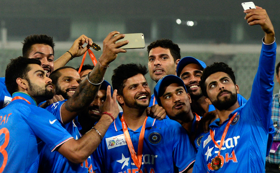 First, let me take a selfie: Indian cricketers celebrate their Asia Cup triumph with multiple selfies to capture the moment. AFP