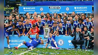 Title after after 5 years! Chelsea celebrate the Premier League title after the match against Sunderland at Stamford Bridge. Getty Images