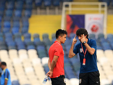 Mumbai assistant coach Oscar Bruzon with Sunil Chhetri. ISL[/caption] Chhetri plays on the left for Bengaluru FC and is quite effective, but there’s no doubt in his mind where he fits best. Which is why it was a surprise to see him deployed on the right against Chennaiyin FC on his ISL debut. Chhetri struggled to influence the game and a switch to the left brought some encouragement, but not the sort Indian fans are used to when seeing him play. This was not an off day, this was a player being played out of position. “He didn’t have the sort of effect we expected he would,” Mumbai City’s assistant coach Oscar Bruzon said after the 2-0 loss. Bruzon also promised a ‘modification’ against Delhi Dynamos – born out of a desperate need to start winning games and get off the bottom of the table. That modification was duly delivered – and it’s effect savagely hammered home by Chhetri in a performance which befits the tournament’s most expensive Indian player. Chhetri was played in what looked like a 4-4-1-1, with the dangerous Sony Norde playing in a free role and Chhetri in a False Nine position. It worked wonders as India’s top-scorer dropped deep to link up play between midfield and attack and surged forward during counter attacks and crossing situations. He converted wonderfully from a loose ball which was a result of Norde’s attempt on goal to give his team the lead and then crept up at the back post in the second half to tap in and seal their first win. “Chhetri is a very adaptable player and can play across the front. He pushes up as a striker and had great understanding with Gabriel Fernandes, Sony Norde and Subhash Singh,” Bruzon said when Firstpost asked him whether the star player had convinced him and manager Nicolas Anelka that his best position was through the middle. Chhetri had more freedom to play alone on top in the first half, especially after the first goal. But when Mumbai City needed control in the final third, the team turned to him and he effortlessly dictated play. At 31, Chhetri isn’t the fastest player on the pitch and he doesn’t have a lot of tricks up his sleeves. His strong points have always been vision, a burst of acceleration and a fine finish – and all these are best used when he is playing with either a burly target man (like Robin Singh at Bengaluru and or Frederic Piquionne at Mumbai City) or with someone willing to run at defenders, beat them with pace and pump the ball into the box from the channels like Norde. Bruzon admitted Mumbai City’s failure to ‘make it work’ against Chennaiyin, and was evidently pleased with what he saw in the next match: “He was like a fish in water,” he said. “Today I can say the combination of players was perfect. We got it right with today’s game model and played players who were fit for this model,” Bruzon said, adding that this was the ’new team’ he and Anelka were building (more like a new tactical model). It could have been a perfect evening for Chhetri had Norde scored off a glorious lobbed through ball but still, it was the sort of moment that had been missing from Mumbai City’s play in their three previous games. With Chhetri at the forefront now, this will change. He is bound to create more chances if he continues to play in that area. Bruzon and Anelka’s modification was simple – play him through the middle. They learned it the hard way but better now than later.