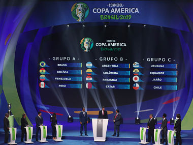 Rio de Janeiro: Hosts Brazil were handed a favourable group at the 2019 Copa America draw in Rio de Janeiro on Thursday but arch-rivals Argentina landed a tough appointment with Colombia. Eight-time winners Brazil, the top seeds in Group A, were given a pool with minnows Bolivia, Venezuela and Peru. [caption id=“attachment_5960421” align=“alignleft” width=“380”] General view as the groups are displayed on a screen following completion of the draw. Reuters/Pilar Olivares[/caption] They will kick-off the tournament on 14 June against Bolivia in Sao Paulo. World Cup hosts Qatar, making their debut in the South American tournament as guests, were not treated kindly by the draw, landing Argentina and Colombia in Group B, as well as Paraguay. Fellow Asians Japan, making their second appearance after a disappointing debut in 1999, also face a tough task to make it through Group C as they drew record 15-time champions Uruguay, holders Chile and Ecuador. Brazil, led by coach Tite, come into the tournament looking to make amends on home soil for their World Cup 2014 humiliation when Germany thrashed them 7-1 in the semi-finals. The hosts, who will have observed with concern a foot injury suffered by star player Neymar for his club Paris Saint-Germain on Wednesday, haven’t won the Copa America since 2007 and last time out failed to even progress to the knock-out stages. It was a shock 1-0 defeat to Peru that sealed their fate in the Copa America Centenario in the United States three years ago, and they will again meet in the final pool encounter on June 22 in Sao Paulo. Argentina’s recent major tournament history is of an even greater concern. Although they have reached four of the last five Copa America finals — losing to Chile in penalties in the last two — they haven’t claimed any major honours since their success in 1993. They start their campaign on June 15 in Salvador against Colombia, who are ranked one place below them in the FIFA rankings and progressed a round further at last year’s World Cup in Russia. Another concern for Argentina is whether or not global icon Lionel Messi will come back to the side for the tournament. He hasn’t played for interim coach Lionel Scaloni who took over the reins after the team’s World Cup debacle, missing six friendlies since then. The final will be played at Rio’s iconic Maracana stadium on July 7. Draw: Group A Brazil Bolivia Venezuela Peru Group B Argentina Colombia Paraguay Qatar Group C Uruguay Ecuador Japan Chile