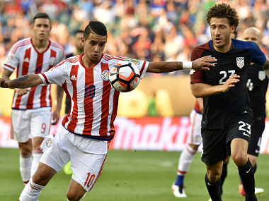 Philadelphia: The United States battled into the Copa America Centenario quarter-finals in Philadelphia on Saturday after a Clint Dempsey goal clinched a 1-0 win over Paraguay. Dempsey shot the hosts into the lead on 27 minutes at Lincoln Financial Field to guarantee them a place in the last eight from Group A along with Colombia, who play Costa Rica later Saturday. [caption id=“attachment_2829772” align=“alignleft” width=“380”] Derlis Alberto Gonzalez and Fabian Johnson during the Copa America. AFP[/caption] But Jurgen Klinsmann’s side were made to sweat through a nerve-jangling second half after DeAndre Yedlin’s rash dismissal left the hosts playing with 10 men for more than 40 minutes. Paraguay spent long periods in the US half but a backs-to-the-wall defensive display from the Americans saw them hang on for a gritty win. The victory left the United States on top of Group A, level with Colombia on six points and the same goal difference but leading on goals scored. Klinsmann hailed his side’s discipline after they regrouped to thwart Paraguay after Yedlin’s dismissal. “It was a fantastic performance,” the German said. “The way they grinded it out, the way they kept their shape and their discipline and the way they worked for each other was outstanding. They all deserve a huge, huge compliment.” Klinsmann meanwhile refused to criticize Yedlin for the loss of control that led to his two yellow cards and an early shower. “He just lost his head for a second,” Klinsmann said of the 22-year-old. “He’ll learn from that mistake. Next time just cool down for a couple of minutes and slowly find your way back into the game.” The defeat sealed Paraguay’s worst Copa America display since 2001, the last time they failed to progress beyond the group stage. Klinsmann fielded the same starting line-up for the third match running, setting up his side in a conventional 4-4-2 with Michael Bradley and Jermaine Jones in the center of midfield protecting the back four. Brooke Shields A confident US opening period saw the hosts probe forward aggressively, although their first shot came from a setpiece, Fabian Johnson curling a free-kick over the wall in the sixth minute. American adventure almost proved costly in the 11th minute however as Paraguay launched a swift counter-attack to set up a three-on-one scoring opportunity. Only a superb covering tackle from John Brooks – later named man of the match – intercepting Miguel Almiron as he bore down on goal, prevented what looked like being a certain Paraguay goal. The opening exchanges also had a noticeable edge, with Celso Ortiz earning an early booking for a crude foul on Gyasi Zardes, only moments after he had flattened Johnson with a rough tackle. Paraguay were the next to threaten however when Dario Lezcano’s header was saved well by Brad Guzan at the American keeper’s near post. The breakthrough came on 27 minute when Zardes went clear down the left flank and crossed for Dempsey who drove in his 51st international goal. The US looked to be firmly in control of the contest leading to half-time, comfortably neutralizing the threat of Paraguay’s attack. Yet the complexion of the game was changed after a moment of madness from Yedlin early in the second half, the US defender picking up two yellow cards within seconds of each other to receive a red card. It left the US needing to mount a massive rearguard action as Paraguay swarmed forward searching for a win that would see them advance. However US keeper Guzan proved up to the challenge, producing an incredible double save from Jorge Benitez on 82 minutes to preserve the US lead.