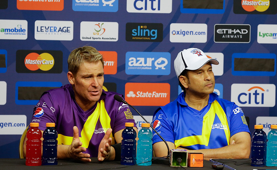 Shane Warne, left, and Sachin Tendulkar answer questions from the media after the Cricket All-Stars Series at Minute Maid Park on November 11, 2015 in Houston, Texas. Getty
